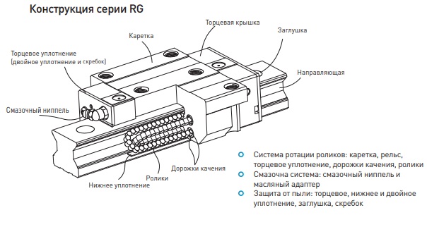 В серии RG в качестве тел качения использованы ролики. Ролики имеют большую площадь контакта по сравнению с шариками и характеризуются большей грузоподъёмностью и жёсткостью.