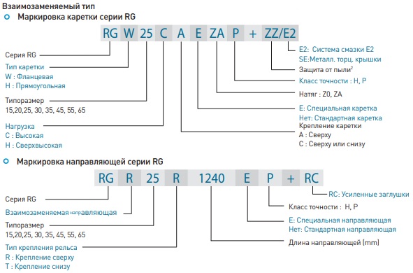 Серия RG подразделяется на взаимозаменяемые и невзаимозаменяемые модели. Их размер идентичен. Единственным различием между двумя типами является то, что сменный тип каретки и рельса могут свободно меняться и их точность ограничивается P- классом. Номер модели серии RG включает в себя размер, тип, класс точности, класс натяга и т.д.