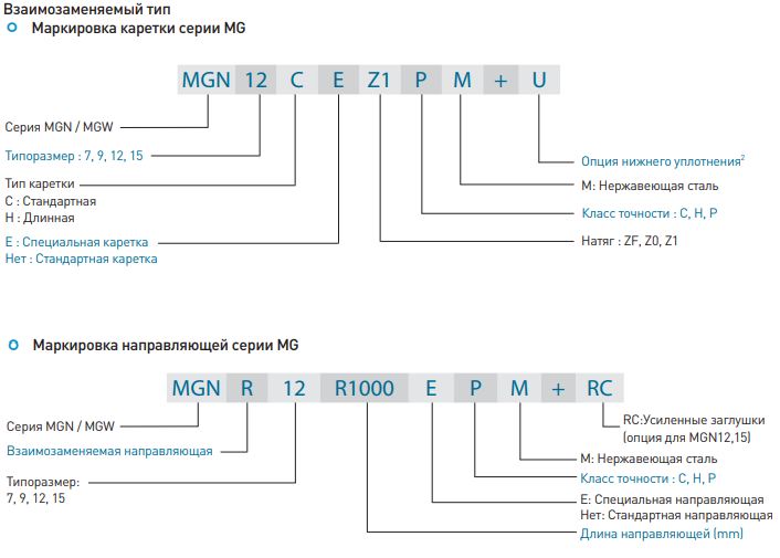 Профильные рельсовые направляющие делятся на взаимозаменяемые и невзаимозаменяемые модели. Размеры обеих моделей одинаковые. Взаимозаменяемые модели удобнее, так как можно свободно заменить каретку или рельс. Их точность, тем не менее, ниже, чем у невзаимозаменяемых моделей. Благодаря строгому контролю соблюдения заданных размеров, взаимозаменяемые модели - отличный выбор для потребителей, у которых профильные рельсовые направляющие устанавливаются на одну ось не попарно. В маркировках указывается размер, модель, класс точности, преднатяг и т. д.