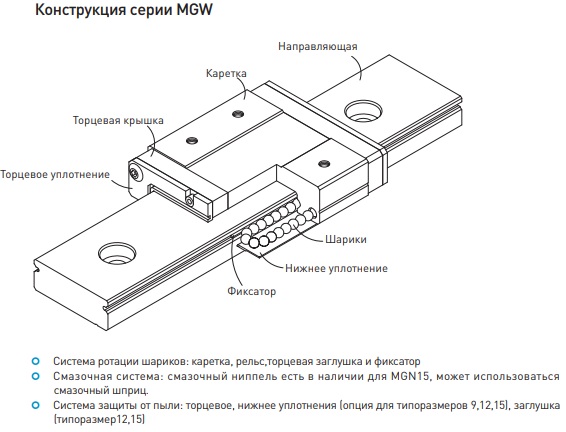 Серии MGN/MGW могут применяться во многих областях, таких как полупроводниковая промышленность, монтаж печатных плат, медицинское оборудование, робототехника, измерительные приборы, автоматизация офисной деятельности и в других областях, где необходимы миниатюрные направляющие.