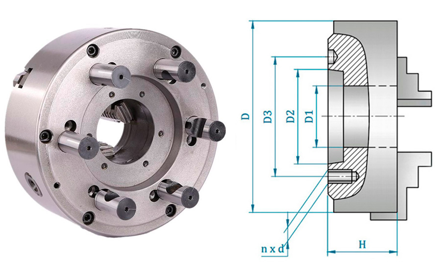 - Патроны токарные БИЗОН тип 3515 HD для обработки труб, с большим отверстием 3-х кулачковые