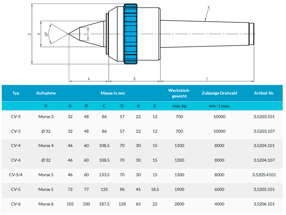 Центр вращающийся с удлинённой вершиной (удлинённой рабочей частью) тип CV для высокоскоростной и прецизионной обработки на токарных станках, включая станки с ЧПУ. Корпус из закалённой стали, вершина из высококачественной стали со сквозной закалкой. Подшипник обеспечивает высокую жёсткость и точность биения до 0,005 мм и менее. Рассчитана на работу при скоростях до 10 000 об/мин, не требует обслуживания до 2000 часов.