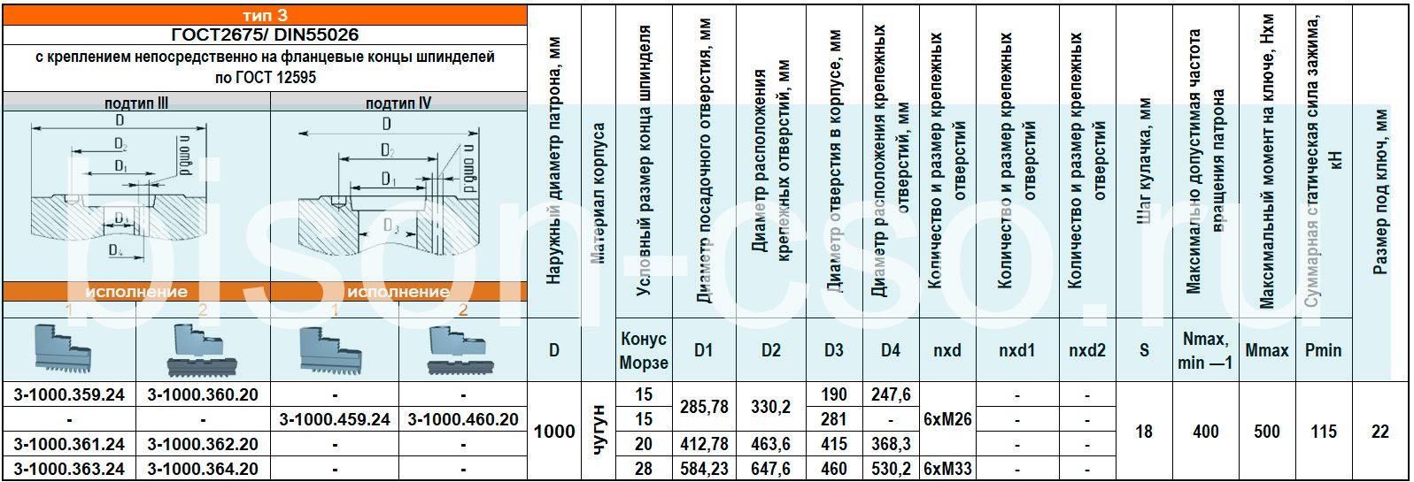 Тип крепления патрона к станку: Тип 3 подтип IV - крепление непосредственно на фланцевые концы шпинделей по ГОСТ 12595