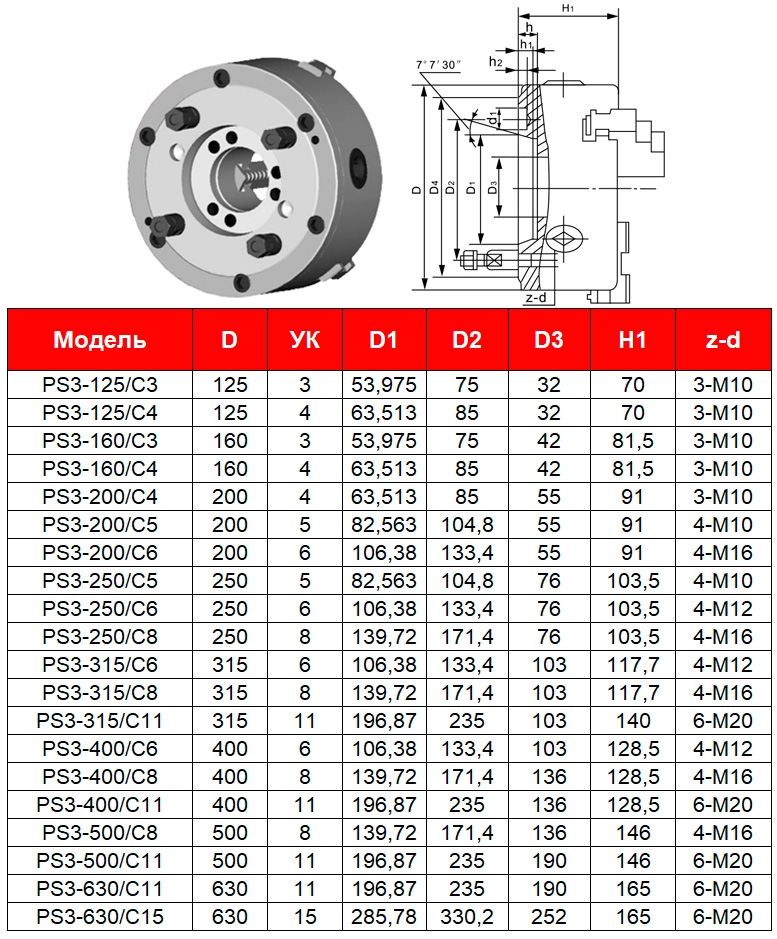 Серия PS3 — это самоцентрирующие трёхкулачковые патроны. Спирально-реечный механизм обеспечивает синхронный ход кулачков, повторяемое центрирование и предсказуемое биение при работе с круглыми и шестигранными заготовками. Конструкция рассчитана на длительную эксплуатацию и стабильность в повседневной работе. Монтаж выполняется через переходной фланец - DIN 6350. Перед покупкой рекомендуется сверить посадочные размеры и схему крепления для корректной установки и соблюдения паспортных параметров.