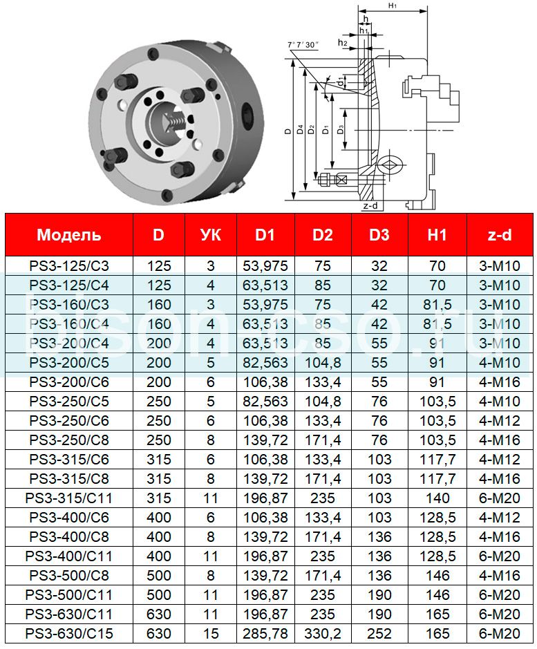 Серия PS3 — это самоцентрирующие трёхкулачковые патроны. Спирально-реечный механизм обеспечивает синхронный ход кулачков, повторяемое центрирование и предсказуемое биение при работе с круглыми и шестигранными заготовками. Конструкция рассчитана на длительную эксплуатацию и стабильность в повседневной работе. Монтаж выполняется через переходной фланец - DIN 6350. Перед покупкой рекомендуется сверить посадочные размеры и схему крепления для корректной установки и соблюдения паспортных параметров.