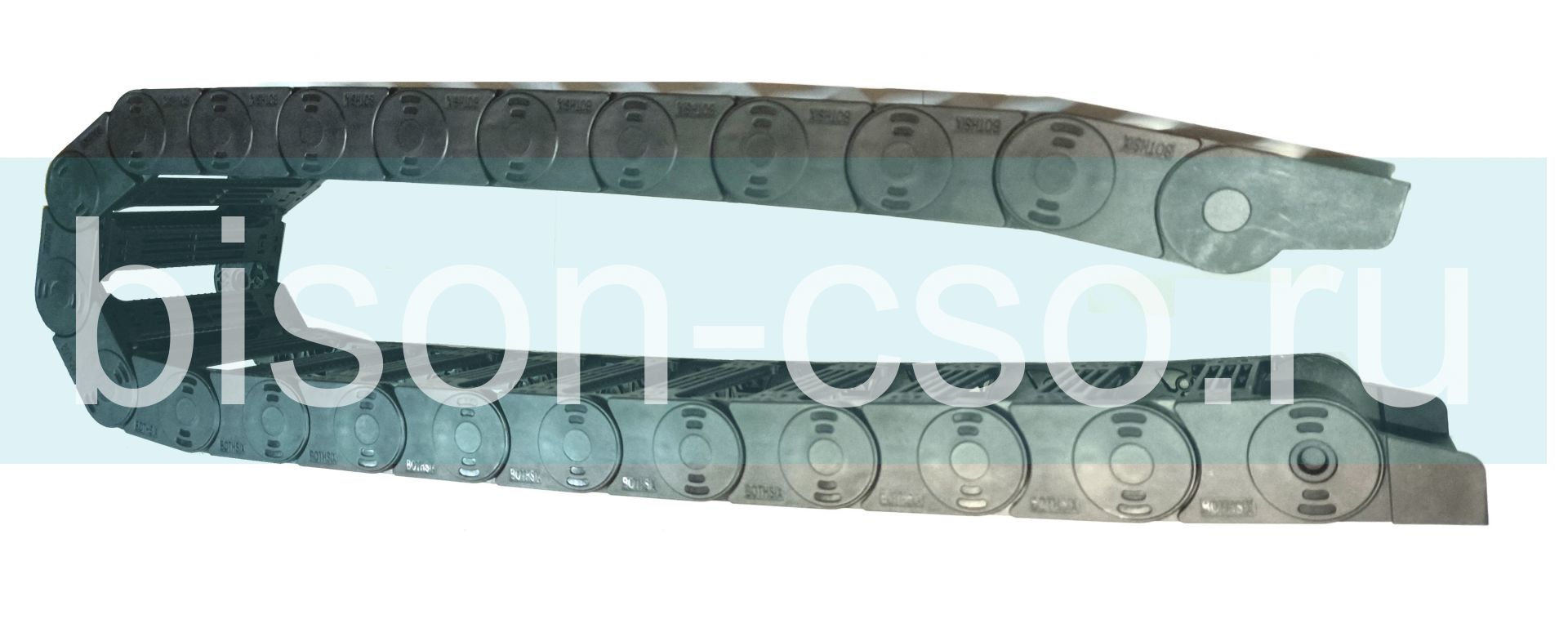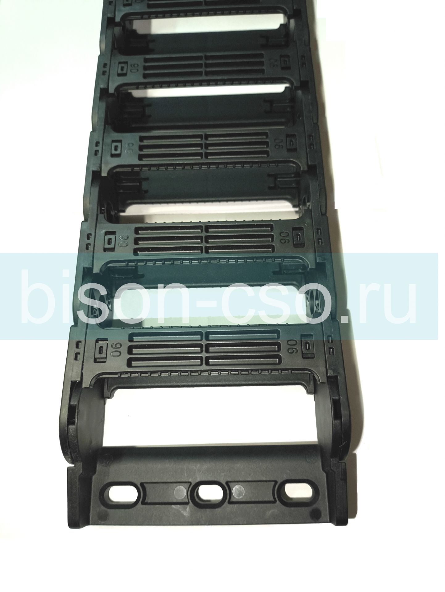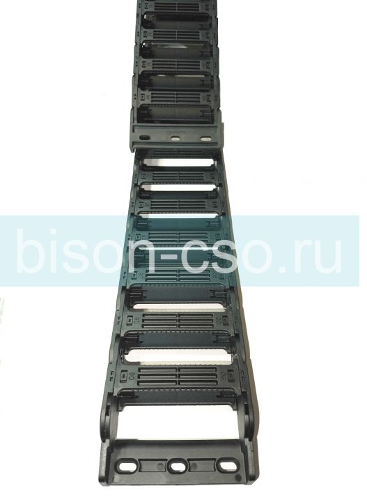 Канал 25x90-R55 открытого типа, звенья открываются внутрь и наружу от изгиба. Энергоцепи можно соединять друг с другом, а также снимать излишние звенья цепи, тем самым создавая необходимую для работы оборудования длину кабельного трака. Каждый кабель-канал TMX Cable Chains уже снабжён комплектом коннекторов(!), что позволяет не задумываться о необходимости их приобретения отдельно.